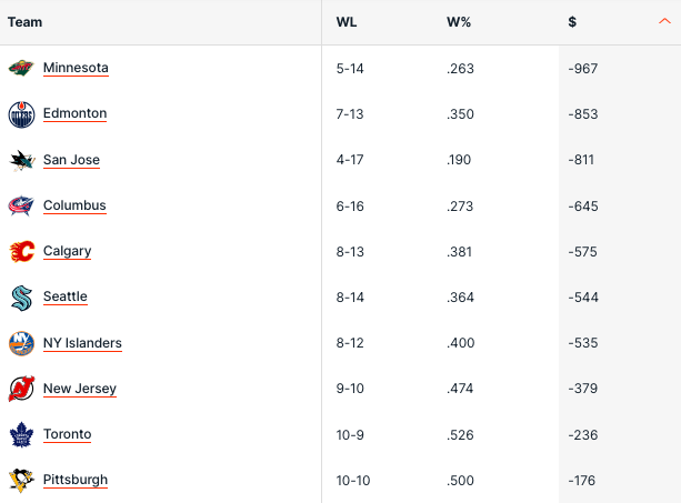 La peggior squadra su cui puntare non è più San Jose Sharks (-8.11) da un un pò, con Edmonton Oilers (-8,53) e Minnesota Wild (-9.67) che stanno facendo anche peggio nei conti degli scommettitori. Completano questa flop-5 Columbus e Calgary.