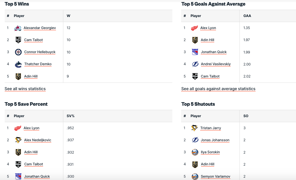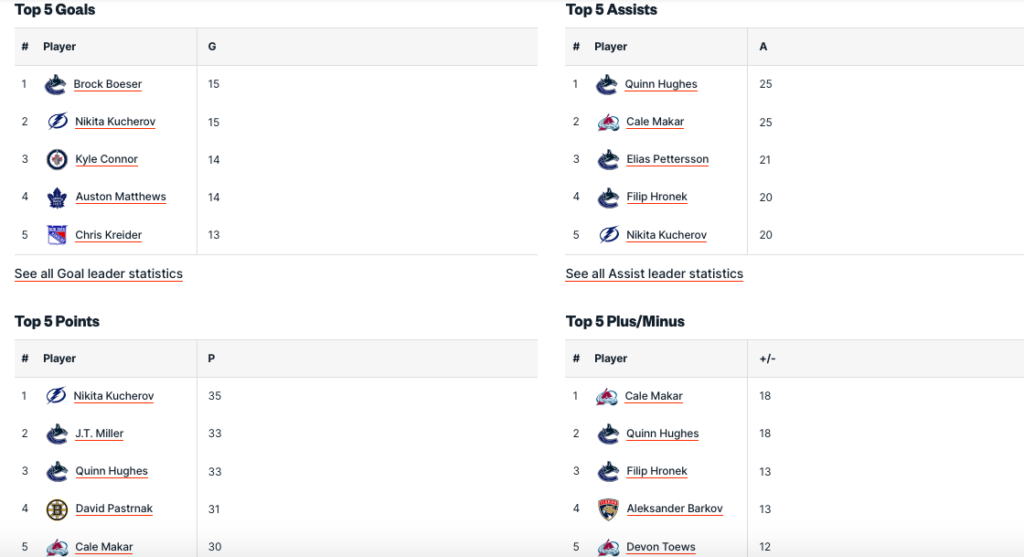 I Boston Bruins in Atlantic Division e i NY Rangers in Metropolitan, si portano entrambe a 31 punti e migliorano il rendimento dei Vegas Golden Knights che però rimangono al comando della Pacific Division con 30 punti, anche se devono guardarsi alle spalle con Vancouver Canucks ed LA Kings con 29 punti, in particolare LAK che nel momento in cui scriviamo ha giocato 2 partite in meno di Vegas. In Central i Colorado Avalanche con 28 punti superano i Dallas Stars a 26, agganciati anche da Winnipeg Jets.
