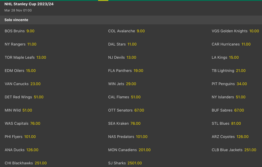 I Vegas Golden Knights perdono il primato nelle lavagne delle quote antepost per la vittoria finale della Stanley Cup, scavalcati da Boston Bruins e Colorado Avalanche. In 4° posizione ci sono i NY Rangers. Ancora snobbati i LA Kings che salgono verso il vertice delle lavagne, ma rimangono lontani dai primi con quota @15 volte la posta.