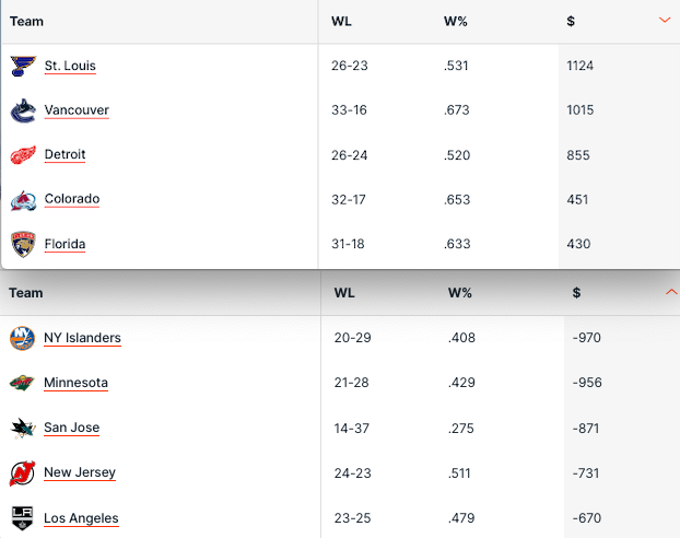 Anche sulle statistiche dell’ultima settimana abbiamo poche variazioni da segnalare. I St.Louis Blues (+11.24 unità) rimangono al vertice come miglior squadra su cui puntare ma la novità arriva dai peggiori, che non sono più i San Jose Sharks che hanno dato piccoli segnali di ripresa, ma Minnesota Wild, e soprattutto NY Islanders che vincendo solo 3 delle ultime 14 partite hanno portato il loro rendimento a -9.70 unità, il peggiore in assoluto nelle scommesse NHL. Di seguito la top-5 e la flop-5 per gli scommettitori: