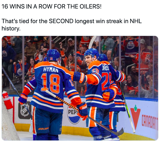 Visto che la settimana scorsa si è giocato poco per via del NHL All Star Game, per questo report piuttosto che fare il nostro solito aggiornamento sulle varie division, vediamo in previsione cosa potrà succedere nei primi giorni di questa ripresa, e tutti i riflettori sono ovviamente puntati ancora una volta sugli Edmonton Oilers visto che questa settimana di ripresa possono pareggiare la striscia vincente più lunga di sempre (17 nel 1992-93 con i Penguins). Se avessimo puntato €10 sulla vittoria degli Oilers ad inizio di questa striscia vincente, e adesso investito tutto il profitto giocando sempre sulla vittoria di Edmonton, oggi avremmo €4.997 in più!!!