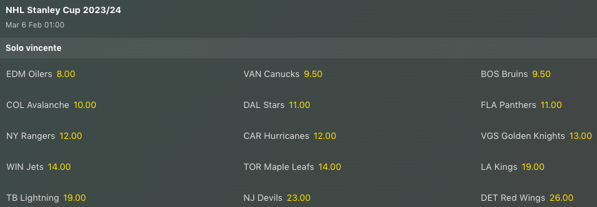 Cambia poco rispetto alla settimana scorsa per le quote antepost Stanley Cup 2024 dove gli Edmonton Oilers rimangono al comando, ma andiamo a vedere anche le quote sulle varie division e anche sui principali premi individuali di stagione come Hart Trophy, Vezina Trophy e Calder Trophy, visto che ne abbiamo parlato anche prima.