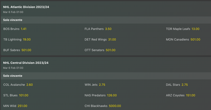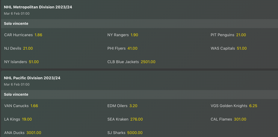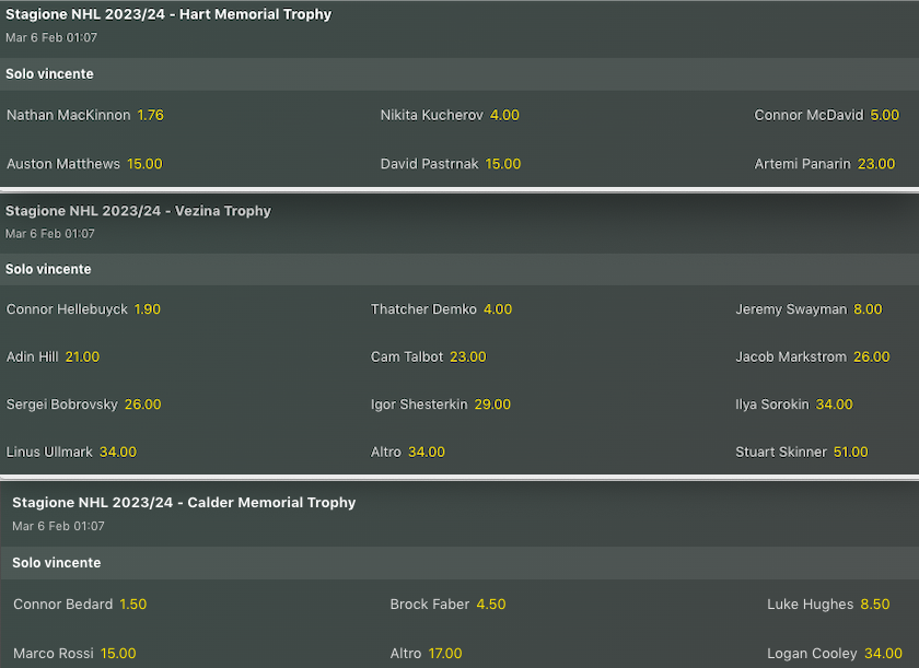 Quote Antepost: aggiornamenti Stanley Cup, Division e premi individuali