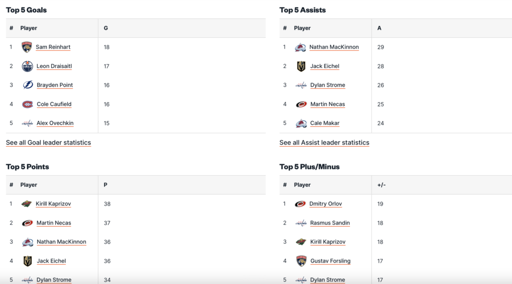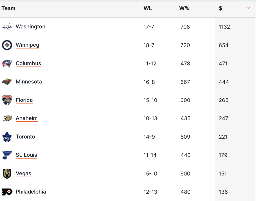 I Washington Capitals si prendono il primato anche di miglior squadra nelle scommesse con +11.32 unità di profitto, unica squadra in doppia cifra, e con quasi il doppio del rendimento rispetto alla 2° in classifica che rimane Winnipeg (+6.54), poi si confermano una grande sorpresa anche i Columbus Blue Jackets (+4.71) che si tengono dietro top team come Minnesota e Florida.