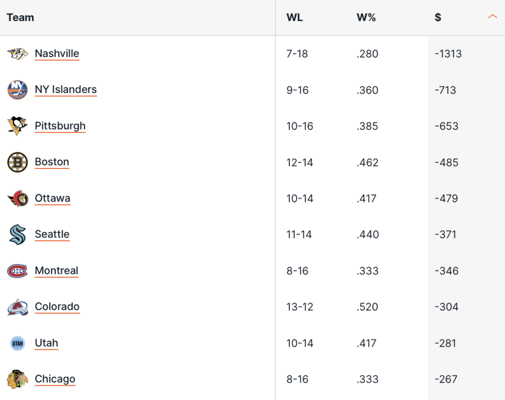 Novità anche nella peggior squadra su cui scommettere, i Nashville Predators che hanno brucato -13.13 unità, staccando tutti, con i NY Islanders a -7.13, poi arrivano i Pittsburgh Penguins a -6.53, che hanno comunque migliorato rispetto alla settimana scorsa dove erano Crosby e compagni i peggiori. Male anche i Boston Bruis che hanno bruciato -4.85 unità.