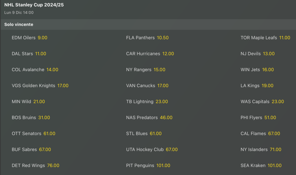 Vediamo gli ultimi aggiornamenti delle lavagne per le quote antepost sulla vittoria finale della Stanley Cup in questa stagione di Hockey su Ghiaccio NHL, una lavagna che rimane sempre apertissima, e che continua a mettere Edmonton davanti a tutti, anche se Florida incalza.