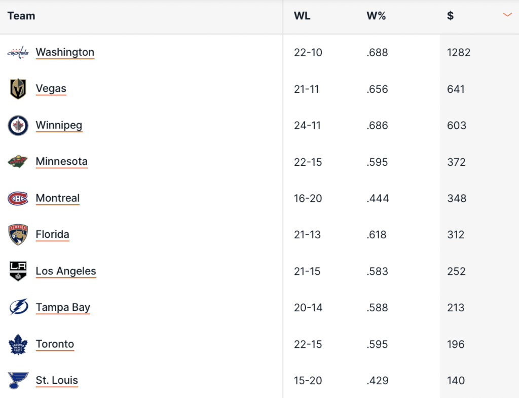 Washington Capitals sempre i migliori anche come rendimento nelle scommesse con +12.82 unità di profitto nel momento in cui scriviamo, praticamente il doppio rispetto ai Vegas Golden Knights, 2° in questa statistica con +6.41u, mentre a completare il podio ritroviamo i Winnipeg Jets (+6.03u); calano parecchio i Minnesota Wild (+3.72u) che però mantengono il 4° posto, davanti ai Montreal Canadiens (+3.48u) che completano la top-5 e sono in grande forma con 5 vittorie nelle ultime 6.