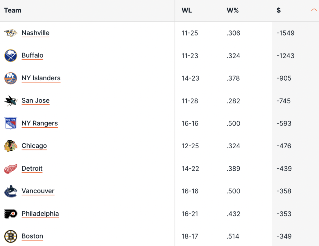 La peggior squadra su cui puntare non cambia, è sempre quella dei Nashville Predators che hanno bruciato -15.49 unità e al 2° posto troviamo i Buffalo Sabres (-12.43u) che abbiamo già detto che stanno deludendo, e lo vediamo anche da questo rendimento nel betting. Su questo scomodo podio ci sono poi i NY Islanders che però sono con un negativo in singola cifra (-9.05u). Sempre male anche i San Jose Sharks, ultimi in Pacific e reduci da altre 7 sconfitte di fila.
