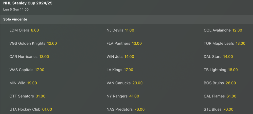Quote antepost: gli ultimi aggiornamenti sulla Stanley Cup