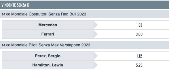 Per quanto riguarda le quote antepost, nella corsa al 2° posto la Ferrari recupera qualcosa, ma non convince analisti e bookmakers che mantengono la Mercedes nettamente favorita. Interlagos probabilmente fatale anche a Lewis Hamilton nel testa a testa con Sergio Perez. Il messicano continua a deludere con la Red Bull, ma l’inglese ha perso troppo terreno dopo il Brasile.