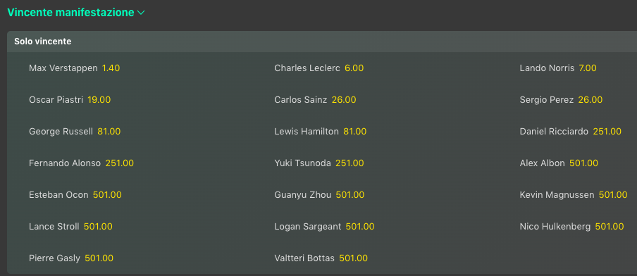 Max Verstappen continua a dominare @1.03 per la vittoria di un altro titolo piloti. I book non credono quindi alla rimonta della Ferrari, ma anche la McLaren ha dimostrato di stare meglio della Red Bull. Stessa cosa per il mondiale costruttori, con la Ferrari che col doppio podio del Principato si torna ad avvicinare alla Red Bull, e si torna a giocare @5.50 di quota, la stessa a cui l’avevamo proposta noi nel pre stagione.