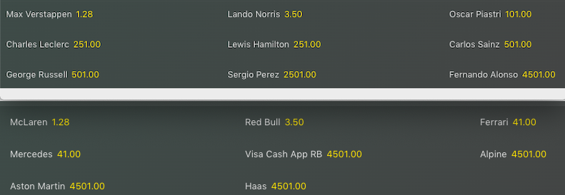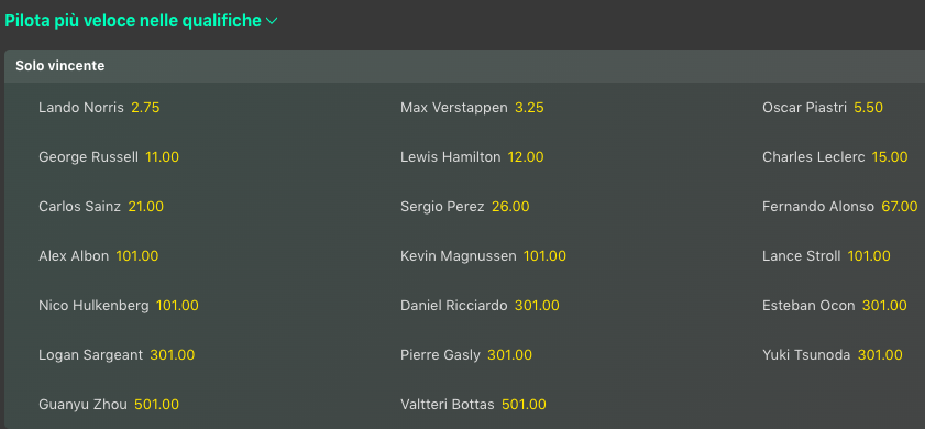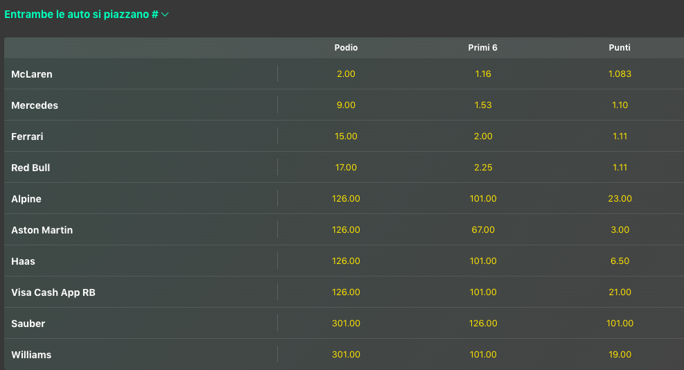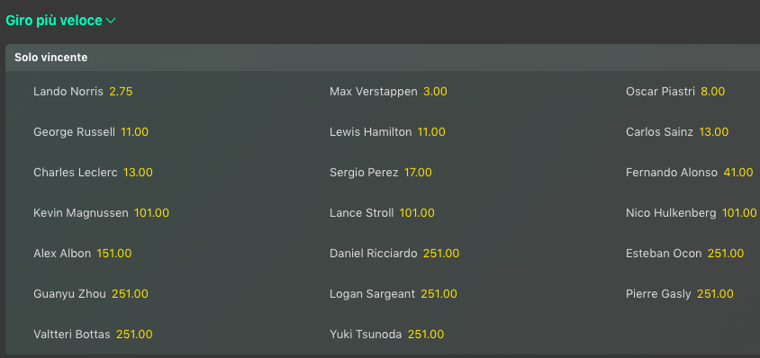 Vediamo anche gli aggiornamenti delle quote antepost. Per il campionato piloti Verstappen rimane nettamente al comando @1.28 di quota, ma nel campionato costruttori le cose cambiano letteralmente visto che adesso come favorita massima c’è la McLaren @1.28, nonostante la scuderia inglese sia ancora dietro qualche punto alla RedBull che però paga un momento di calo, tante partenze interne nel team che si sta sgretolando, e un Perez sempre insufficiente.