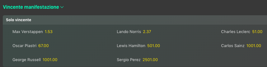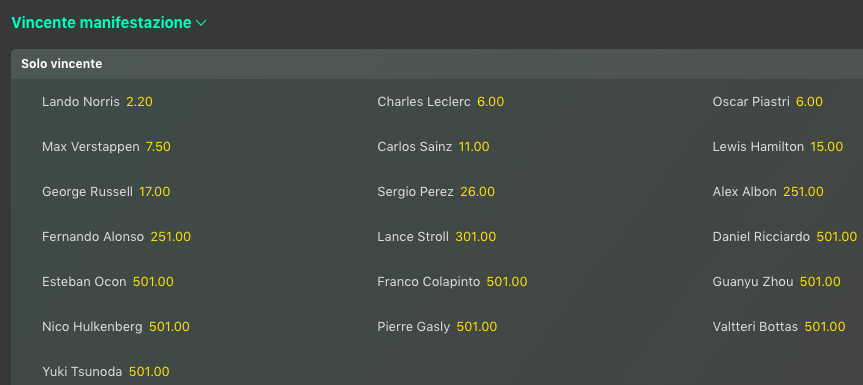 Ora una settimana di pausa poi si tornerà in pista a Baku per il GP Azebajian 2024 dove abbiamo subito una sorpresa interessante, non tanto quella di Lando Norris favorito assoluto @2.20, ma quella di Charles Leclerc @6.00 che aggancia Oscar Piastri e si presenta come principale avversario della McLaren, meglio di Max Verstappen mai così lontano @7.50 volte la posta mentre con Carlos Sainz si sale in doppia cifra @11. In affanno la Mercedes, e lo vediamo anche dalle quote di Lewis Hamiltipn e George Russell, rispettivamente @15 e @17 volte la posta.