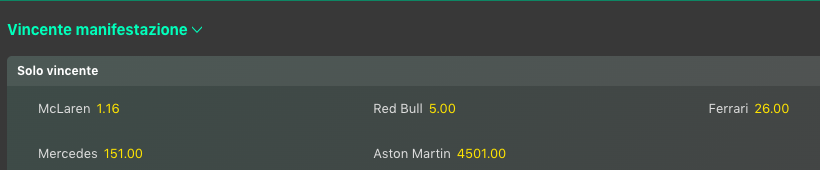 Nelle quote antepost il vantaggio che Max Verstappen può gestire nel campionato piloti, lo tiene ampiamente in testa alle lavagne @1.53, anche se Lando si avvicina @2.37. Tutto cambiato nel mondiale costruttori con la McLaren che ora domina @1.16 sulla Red Bull @5 mentre il sogno Ferrari rimane difficile e quotato @26 volte la posta.