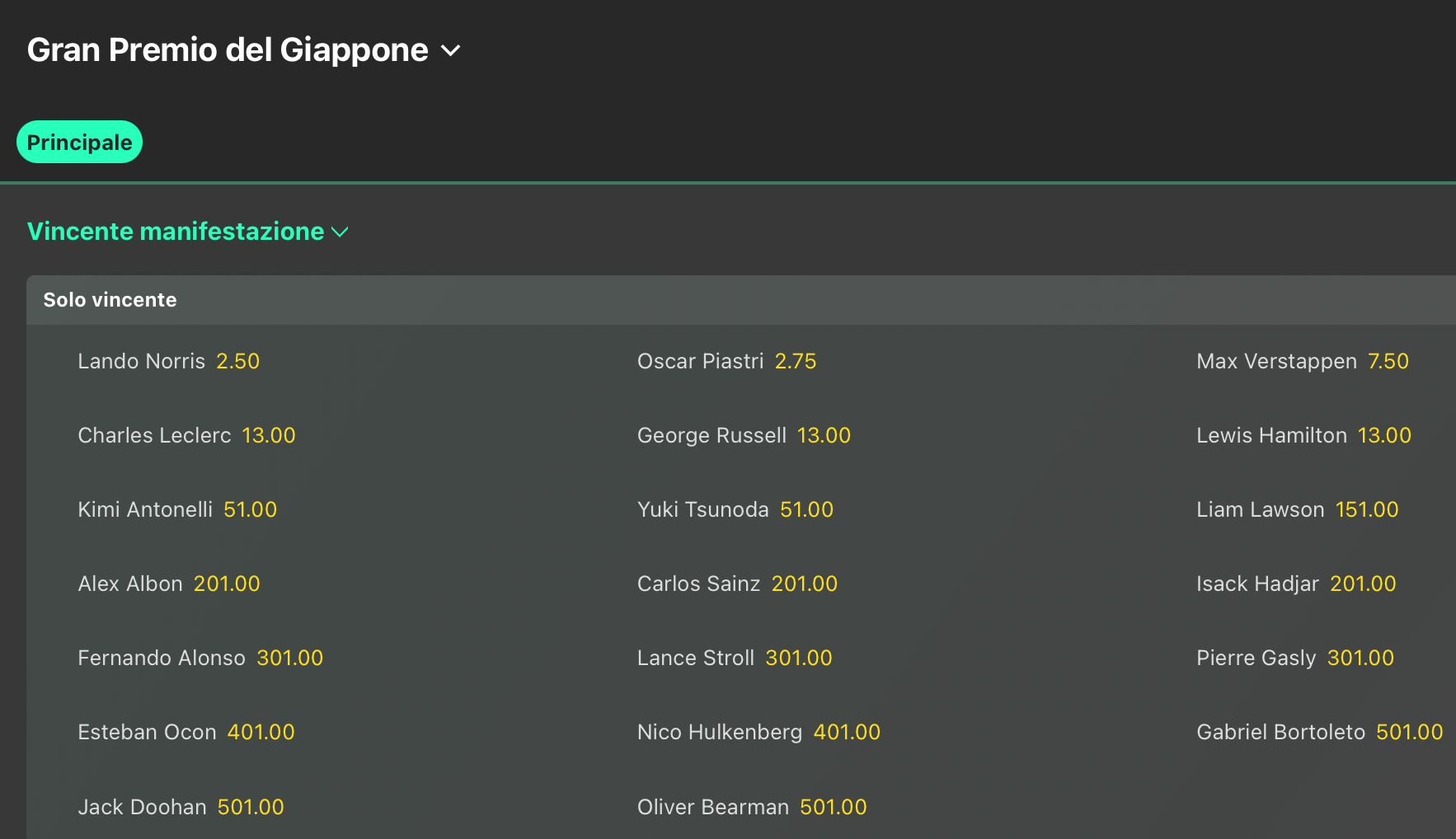 Anche in Giappone è favorita la McLaren, questa volta di Lando Norris @2.50 chiamato a rispondere al compagno Oscar Piastri @2.75 che però è vicinissimo al compagno in papaya. Il terzo incomodo è sempre Max Verstappen @7.50 nonostante i problemi della Red Bull. Si gioca @13 volte la posta George Russell che sta facendo molto bene con Mercedes, mentre il compagno rookie, Kimi Antonelli, si gioca @51 volte la posta, assieme al pilota di casa, Yuki Tsunoda. In quota @13 anche i due ferraristi, Charles Leclerc e Lewis Hamilton.