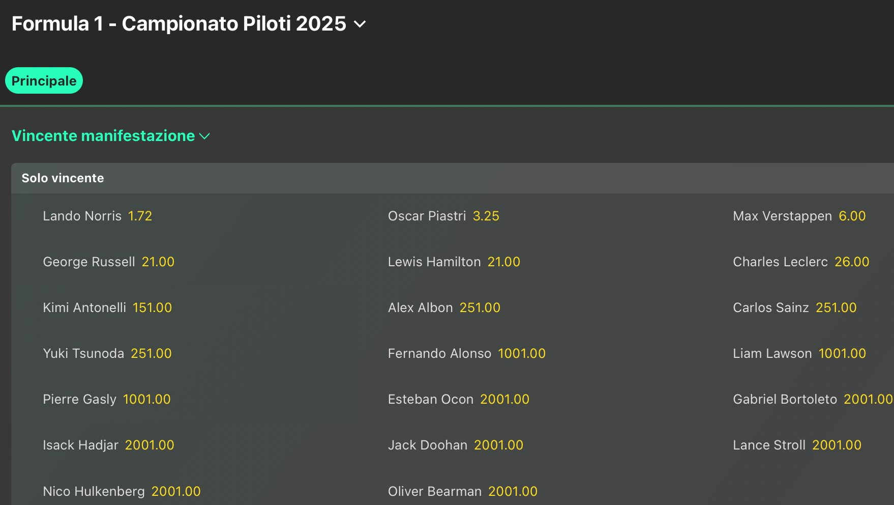 Vittoria di Oscar Piastri, ma è Lando Norris a rimanere in testa alle lavagne delle quote antepost per la vittoria finale del mondiale piloti @1.72, ma il compagno di team australiano è calato di colpo @3.25, scendendo dalla quota @5.50 dopo il primo appuntamento della stagione a Melbourne, mentre chi sale è Max Verstappen che passa da quota 5 della settimana scorsa, all’attuale @6.