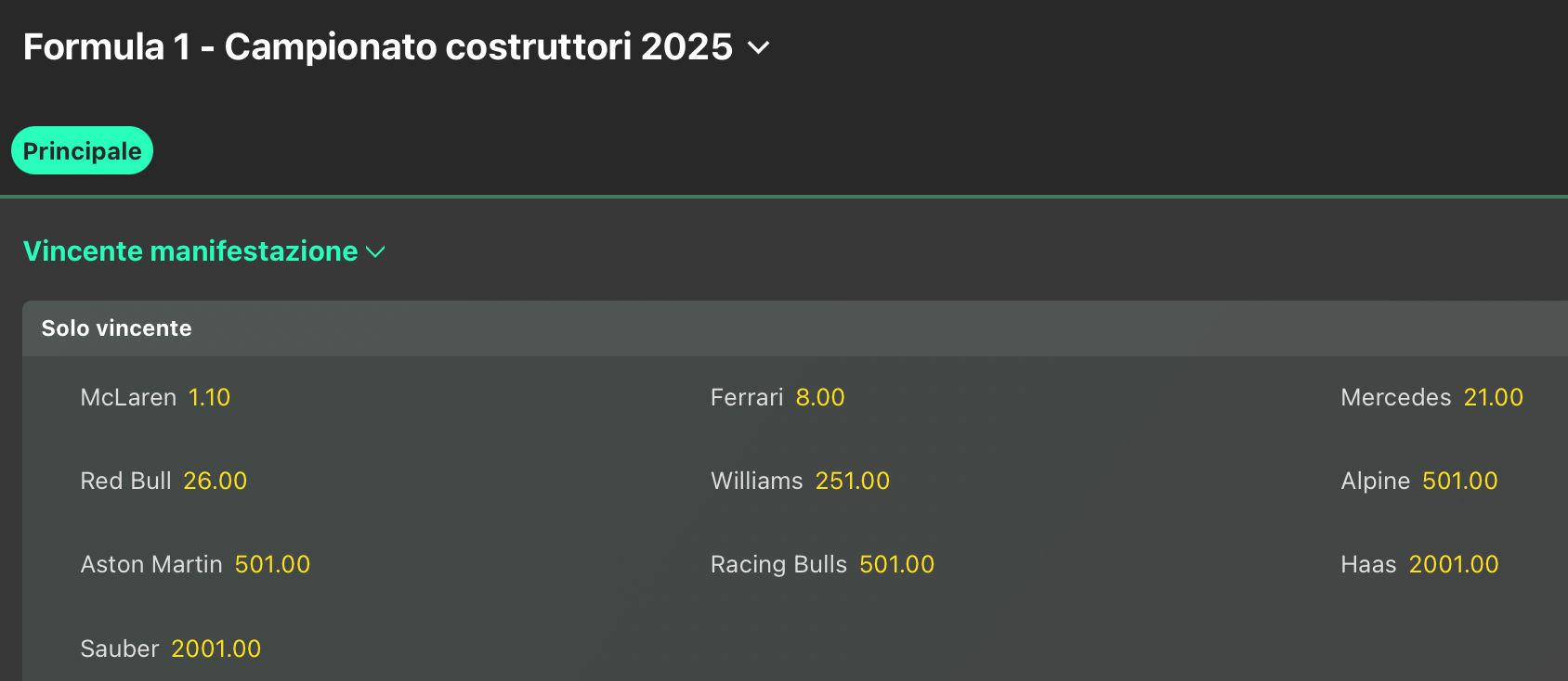 Ancora più marcata la situazione nelle lavagne delle quote antepost per il Titolo Costruttori dove domina la McLaren @1.10, favorita per il bis del titolo vinto lo scorso anno. Qui la Ferrari rimane la seconda forza @8, ma attenzione alla Mercedes @21 che si lascia alle spalle la Red Bull @26.