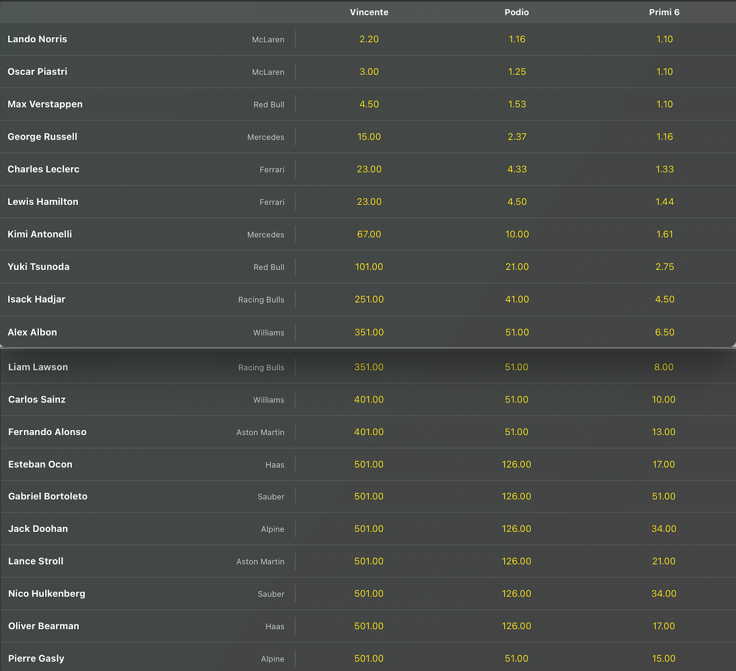 Nel costruttori quote rasoterra per il bis della McLaren @1,07, dopo il doppio podio di ieri. Grosso passo indietro invece per la Ferrari, salita da 6,50 a @15, dopo il quarto posto di Leclerc e il settimo di Hamilton, e raggiunta dalla Mercedes. Avanza anche la Red Bull, trascinata da Mad Max, da 25 a @20.