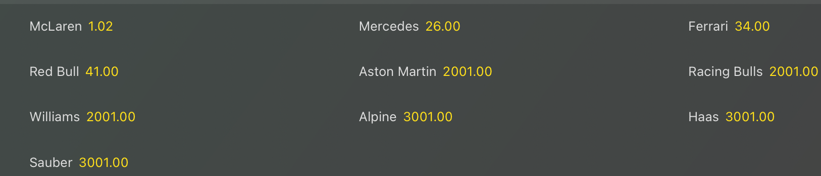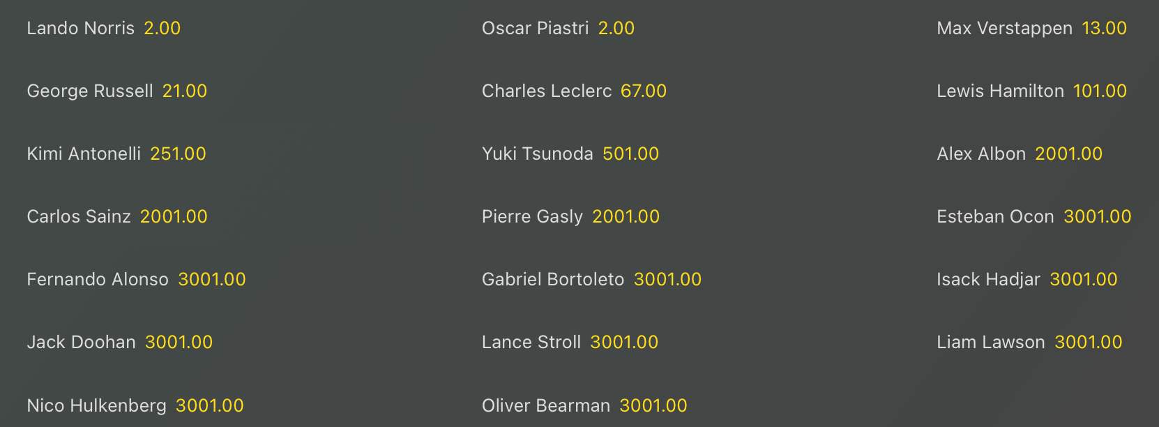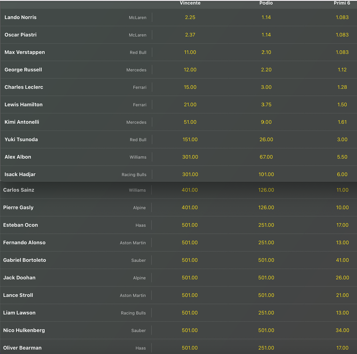 Lando Norris rimane il favorito dalle quote antepost per la vittoria del Mondiale Piloti 2025 di Formula 1, ma non è più solo, è una posizione che ora deve condividere col compagno di scuderia Oscar Piastri, entrambi offerti @2, con Max Verstappen che torna ad allontanarsi @13 volte la posta, per non parlare di George Russell @21 e soprattutto dei ferraristi Charles Leclerc @67 e Lewis Hamilton @101 già in tripla cifra, davanti a Kimi Antonelli @251. Dopo pochi GP sembrano già chiuse le lavagne per il titolo costruttori dominato da McLaren @1.02.