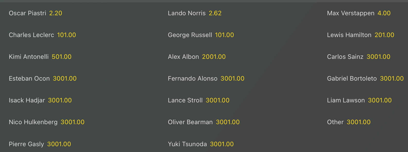 Torna il testa a testa interno alla McLaren con Oscar Piastri @2.50 nuovamente favorito per la vittoria in gara sul compagno Lando Norris che però è vicinissimo @2.75, con Max Verstappen @4.50 che è sempre il terzo incomodo. Ancora snobbato Charles Leclerc che si gioca alto @13 per la vittoria al Montmelò mentre con George Russel @17 e Lewis Hamilton @34 si sale ulteriormente, mentre Kimi Antonelli è offerto @41 volte la posta.