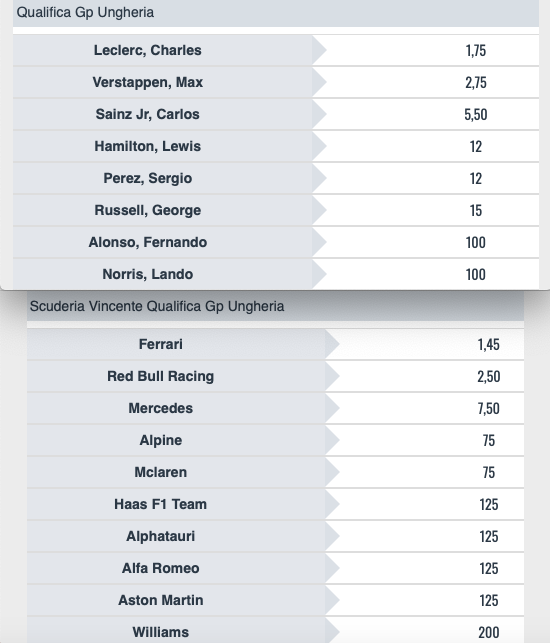 Qualifiche e libere. Le quote per la pole position e per le prove libere, come accaduto spesso in questa stagione, sono a favore della Ferrari. Per quello che riguarda le qualifiche, Leclerc è @1,75 con Verstappen @2,75 (terzo Sainz @5,50), mentre nelle libere il miglior tempo del monegasco è quotato @2,25, con il leader del Mondiale @3,00 e Sainz ancora terzo incomodo @5,50.
