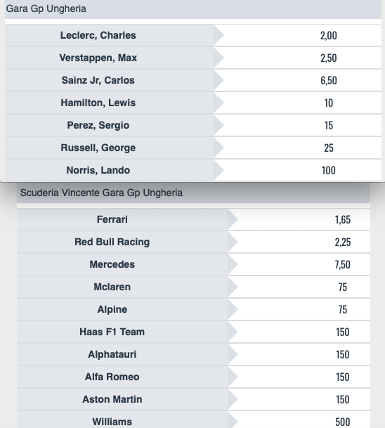 La settimana scorsa in Francia siamo andati in cassa con la vittoria Red Bull giocata a @2 di quota. La nostra strategia era quella di andare sulla Red Bull in Francia per poi puntare sulla Ferrari che dovrebbe adattarsi meglio in Ungheria, tracciato che non è quello preferito dalla monoposto austriaca invece. I bookmakers lo sanno e quotano la vittoria Ferrari @1.45 un pò ovunque, una quota molto bassa ovviamente, ma su BET365 troviamo valore perché la stessa giocata sale @1.72 e questa è la nostra free pick per l’ultimo weekend di F1 prima della pausa estiva.