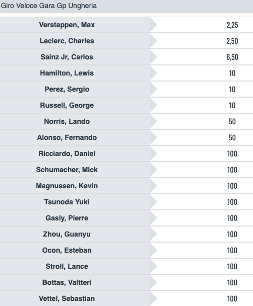 Il monegasco, però, all’Hungaroring parte favorito sulla lavagna Snai: il suo successo è a quota @2, con Verstappen @2,50 e l’altra Ferrari di Carlos Sainz @6,50. In doppia cifra Lewis Hamilton @10, Sergio Perez @15 e George Russell @25.
