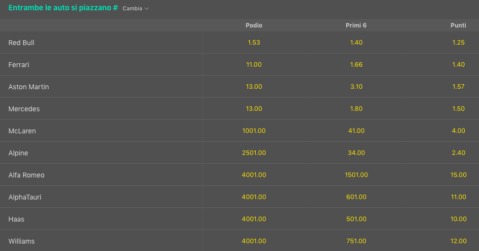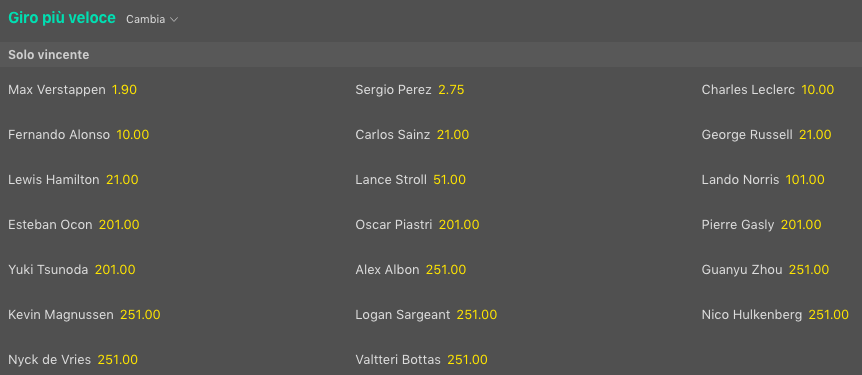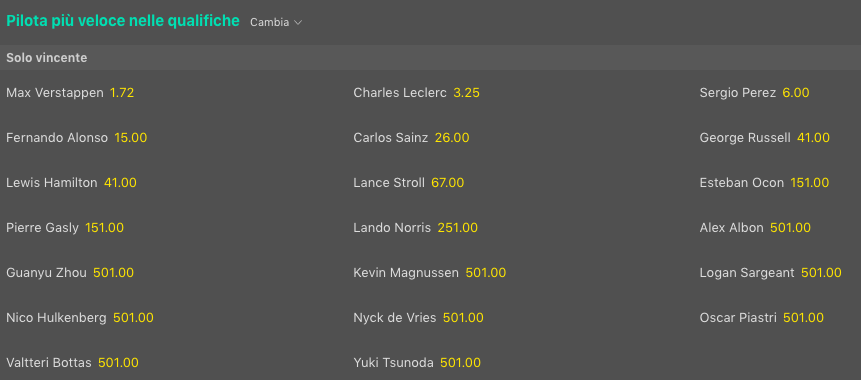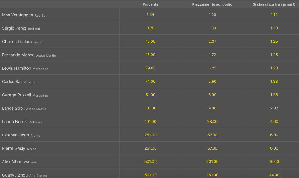 Parte alla pari con il ferrarista Fernando Alonso che, dopo tre podi e un quarto posto con la Aston Martin, vorrebbe riassaporare il successo in Formula 1 che manda da dieci anni esatti. Il resto del gruppo, al momento, è tutto in doppia cifra: Carlos Sainz e Lewis Hamilton sono offerti @16 mentre George Russell, sulla seconda Mercedes, primo sotto la bandiera a scacchi pagherebbe @20 volte la posta.