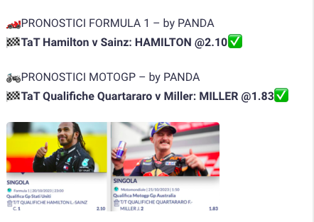 Arriviamo da una bella cassa in MotoGP la settimana scorsa, con doppietta di Panda che ci ha mandato a premio anche con la F1 ad Austin. Per questo GP di diamo appuntamento sul canale Telegram dove ogni giovedì trovate le nostre selezioni in free pick, che al momento non sono ancora disponibili. Ci prendiamo un pò di tempo, magari vedendo prima le libere per farci un idea delle forze in pista, anche perché le quote scarseggiano come al solito e la MotoGP è sempre più imprevedibile, basti pensare che da ben 22 GP non vince un pilota per due gare di fila, una striscia che potrebbe allungarsi ancora visto che una doppietta di Zarco non se l’aspetta quasi nessuno.