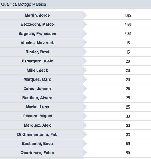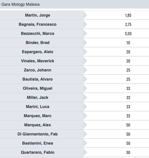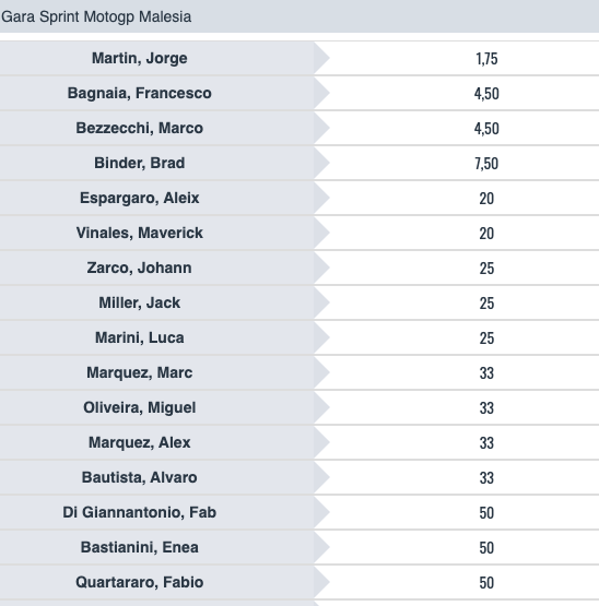 Il resto del gruppo parte tutto in “doppia cifra”: i due piloti Aprilia, Maverick Viñales e Aleix Espargaró sono offerti @20, mentre Marc Márquez (che ha già messo le mani avanti dicendo che si aspetta di soffrire sulle curve lunghe di questo tracciato), Luca Marini, Johann Zarco sono in quota @25 appaiati alla wild card Álvaro Bautista che torna in MotoGP dopo 5 anni e due titoli mondiali vinti in SBK.