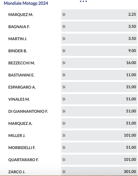 La coppia più solida sembra rimanere però quella che si è giocata il titolo nel 2023, con Francesco Bagnaia e Jorge Martin dati alla pari entrambi @3.50 volte la posta. Per Pecco sarebbe un tris storico. In seconda fascia troviamo la KTM di Brad Binder che con un anno in più di maturazione potrebbe fare il grande salto.