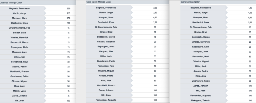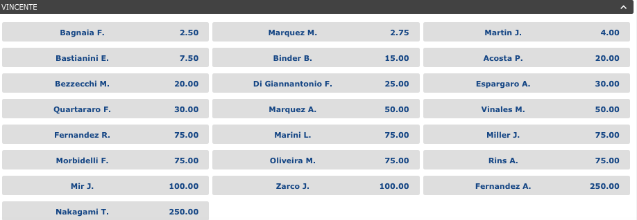 Per il primo GP della stagione, come è stato per la F1, partiamo con i piedi di piombo e non facciamo giocate principali. Un consiglio su una quota di valore, fuori bilancio, però ve lo diamo lo stesso. Visto che in antepost, a differenza della F1, non ci siamo mossi, vi diamo comunque un azzardo ma ben ripagato sulla pole con Enea Bastianini QUALIFICA @9.00 di quota massima.