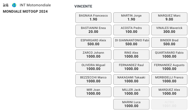 Dopo Aragon Francesco Bagnaia e Jorge Martin si ritrovano appaiati anche nelle lavagne delle quote antepost per la vittoria finale del titolo iridato. Entrambi si giocano @1.90 di quota, con Marquez staccato @9 volte la posta.