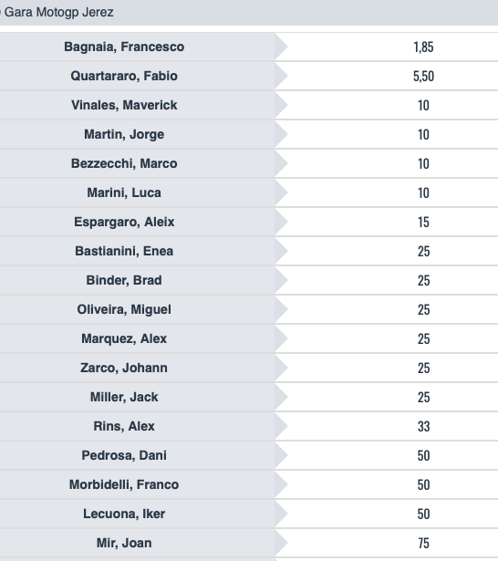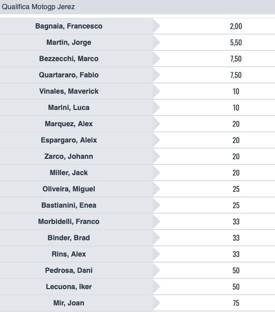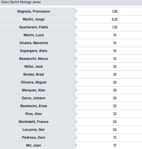 Simili le gerarchie anche nella Sprint Race: Bagnaia guida @1,85, seguito da Martin @6,50, da Quartararo @7,50 e da un gruppo di quattro piloti @10, formato da Bezzecchi, Marini, Vinales e Aleix Espargaro.