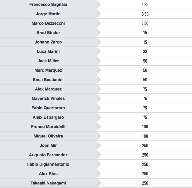 A seguire, ecco Marco Bezzecchi, che perde un po’ di terreno ma rimane comunque in scia: anche la quota del pilota del Mooney VR46 Racing Team rimane di fatto invariata, @7,50, mentre per Johann Zarco si gioca @15 dopo i due podi consecutivi (una settimana fa si giocava a 35). Alla pari del francese, ecco Brad Binder. Weekend da incubo per Marc Marquez, con cinque cadute e un feeling irrimediabilmente deteriorato con la Honda: il titolo mondiale dello spagnolo si attesta @50, alla pari con Enea Bastianini; @75 Fabio Quartararo.
