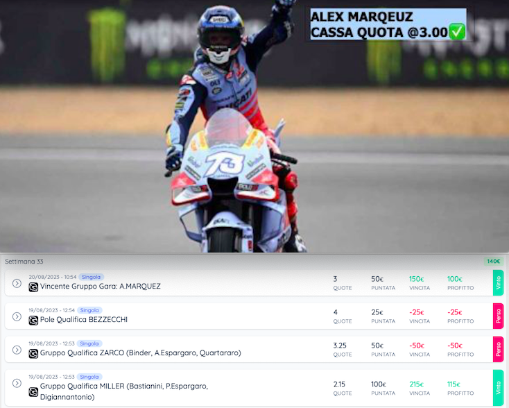 Da segnalare anche la Ducati Gresini di un positivo Alex Marquez, 5° al traguardo al termine di un doppio duello con i due italiani, e che ci manda comunque in cassa in quota @3.00 con la FREE PICK che Panda aveva selezionato anche per il canale TELEGRAM BETTING MANIAC pubblico. Il giorno prima avevamo chiuso in profitto le qualifiche grazie alla giocata principale centrata su Miller che vince il suo gruppo.