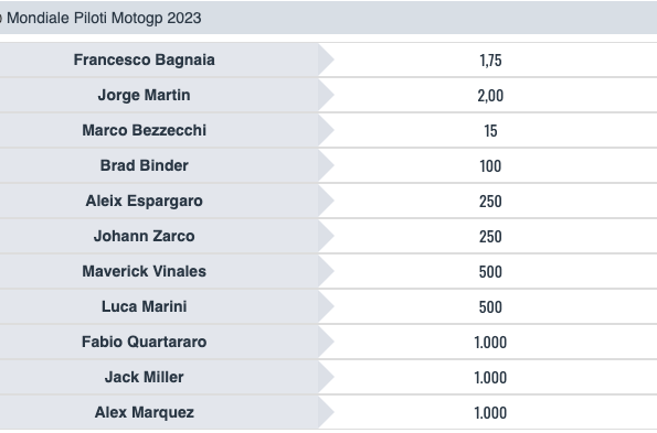 Anche i bookmakers riaprono il motomondiale con Jorge Martin che in 3 GP è sceso da @11 all’attuale quota di @2 per la vittoria in MotoGP. Francesco Bagnaia @1.75 anche qui però, come nella classifica punti, mantiene un leggero vantaggio, nonostante l’italiano in Asia non dia il meglio come fa in Europa.