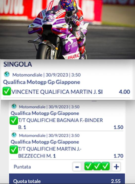 Settimana perfetta dopo un GP di pausa con l’insidiosa India dove non si era mai corso, e dove non ci siamo presi rischi senza dare giocate, cosa che abbiamo però fatto a Motegi consigliando la pole di Martin @4 nel free, ma anche un doppio testa a testa @2.55 (sempre sulle qualifiche) con lo stesso Martin e Bagnaia.
