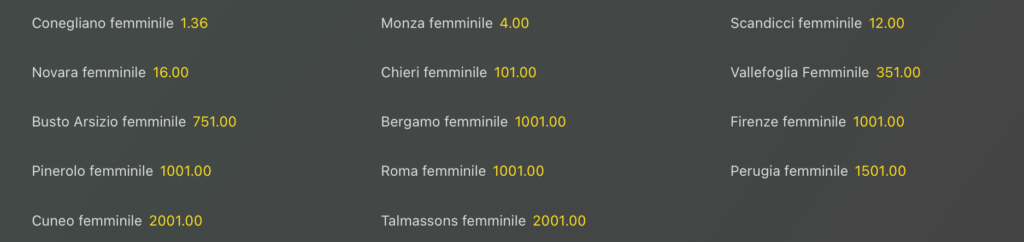 Vediamo gli ultimi aggiornamenti delle lavagne per le quote antepost sulla vittoria finale della Serie A1 Femminile 2024-2025 di volley in Italia, dove è sempre Conegliano a dominare, con Monza prima avversaria, ma molto staccata.