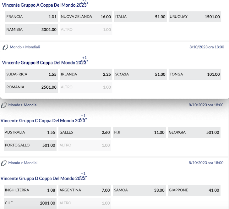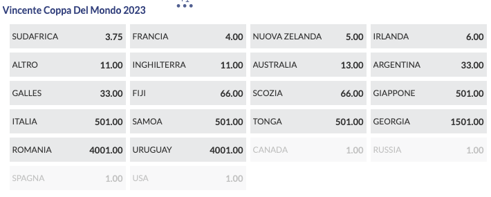 Vediamo il programma completo del 2° turno di Rugby World Cup 2023 secondo SNAI e a seguire le quote antepost EUROBET per la vittoria dei gironi e la vittoria finale della competizione.