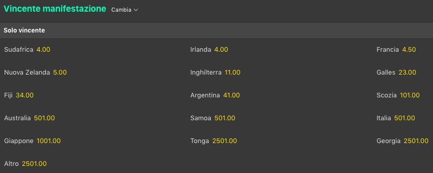 Il Sudafrica @4 rimane favorita assieme all’Irlanda @4 per la vittoria finale della World Cup 2023 di Rugby, ma Francia @4.50 e Nuova Zelanda @5 sono molto vicine, poi si sale nettamente in doppia cifra con l’Inghilterra @11 e il Galles @23. Un miracoloso successo dell’Italia si gioca @501 volte la posta.