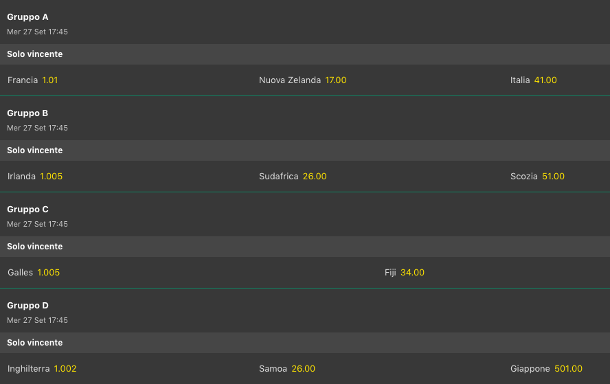 Per la vittoria dei gironi i giochi sembrano già fatti in tutti i gruppi, a noi interessava particolarmente il Gruppo B dove vi avevamo consigliato la vittoria dell’Irlanda che vi avevamo consigliato @2.20 di quota, e ora è @1.005, con Sudafrica @26!!!