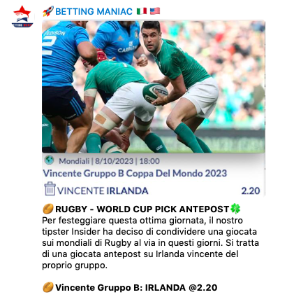 Per essere sempre aggiornato seguici anche sul canale TELEGRAM BETTING MANIAC gratuito. Se vuoi tutto entra nel VIP con una piccola spesa, o anche gratis con le nostre promozioni. Contattaci per tutte le informazioni. Siamo anche su YouTube con i nostri video e su Instagram e Twitter.