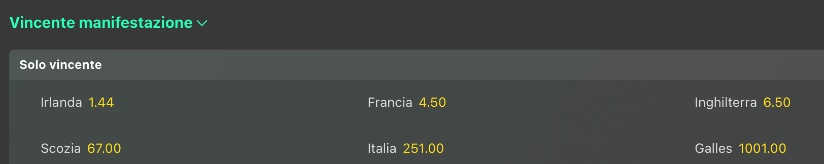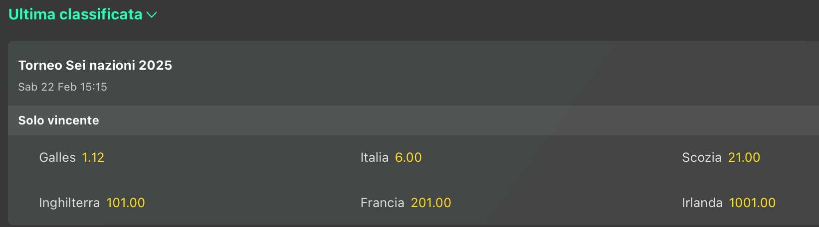 Staccate le altre, ad iniziare dalla Scozia @67, per non parlare dell’Italia @251 volte la posta, e il Galles che si gioca addirittura a mille! Un Galles che domina ovviamente la lavagna per l’ultimo posto @1.12 dopo la sconfitta contro l’ItalRugby, un ottima notizia per la nostra giocata antepost sul cucchiaio di legno ai dragoni (presa @1.66), come siamo contenti del crollo dell’Irlanda per la vittoria finale @1.44, altra giocata che avevamo proposto @2.75 prima dell’inizio del torneo.