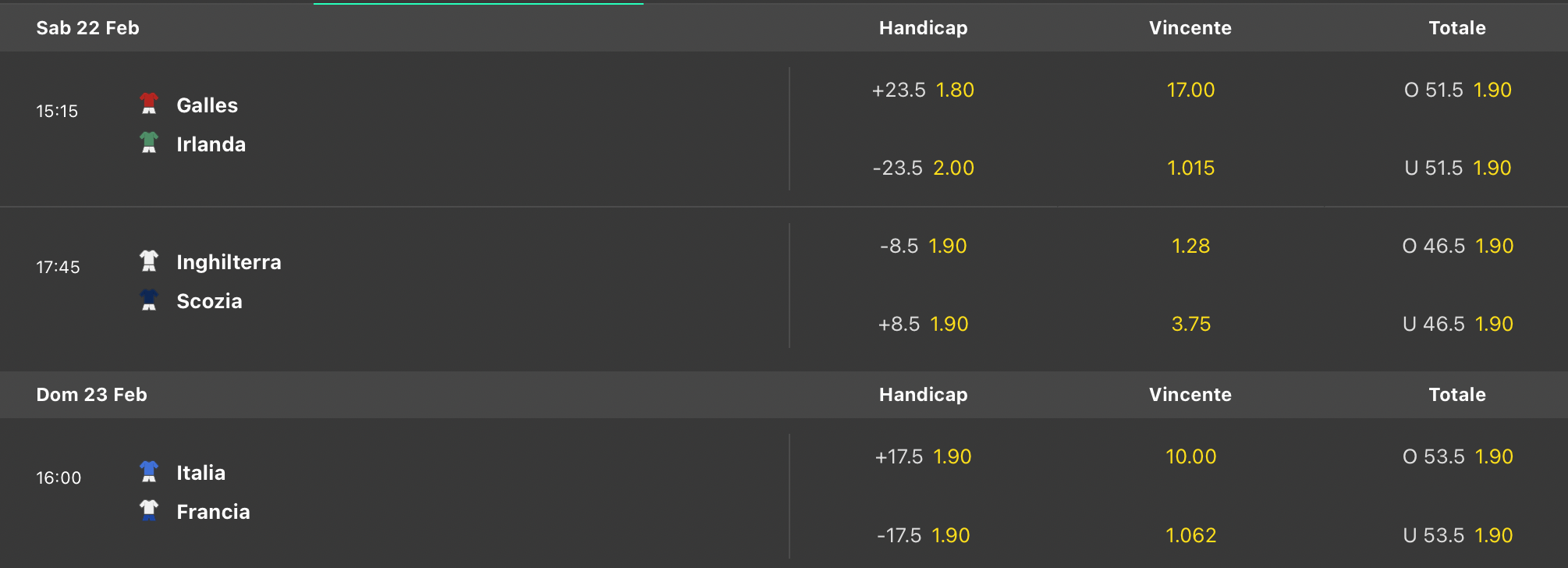 Gli azzurri giocano invece domenica, alle ore 16:00 dallo Stadio Olimpico dove arrivano i transalpini vogliosi di riscatto in Italia-Francia. Vediamo tutte le sfide e le principali quote per le scommesse con testa a testa, handicap ed O/U punti totali per i prossimi match.