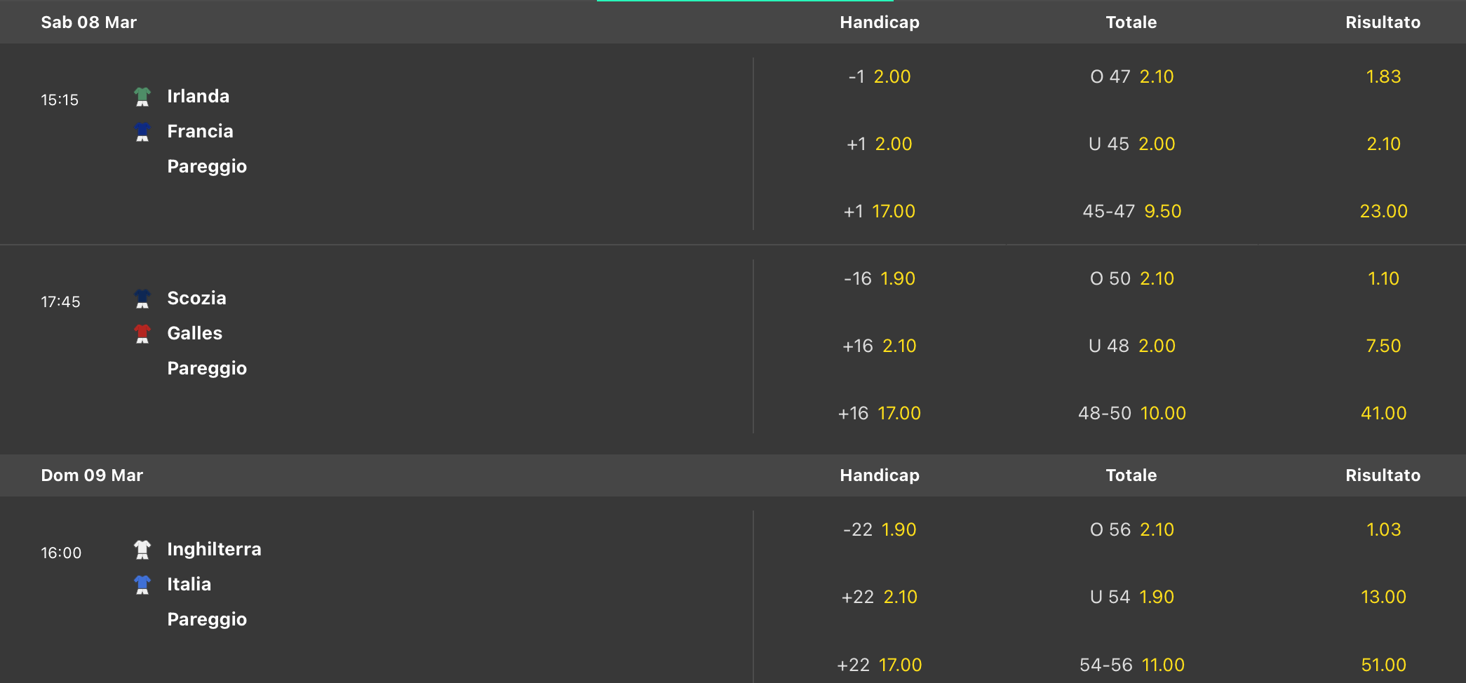 Testa a testa tra Irlanda e Francia per la vittoria finale del 6 Nazioni secondo le quote antepost di Unibet, con gli irlandesi molto più avanti sui transalpini. Più indietro proprio l’Inghilterra, già fuori dai giochi Italia e Galles che pensano ad evitare il cucchiaio di legno come obiettivo stagionale.