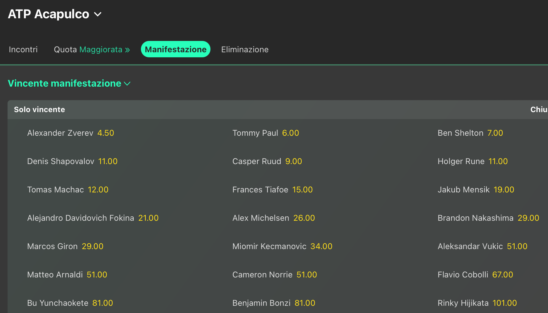 Ad Acapulco è ovviamente Alexander Zverev l’uomo da battere, favorito @4.50 per la vittoria finale, con Tommy Paul @6 primo avversario, poi abbiamo Ben Shelton @7 e Casper Ruud @9. Con Denis Shapovalov si sale in doppia cifra @11, assieme ad Holger Rune. Italiani molto indietro, con Matteo Arnaldi il migliore dei nostri @51 volte la posta.