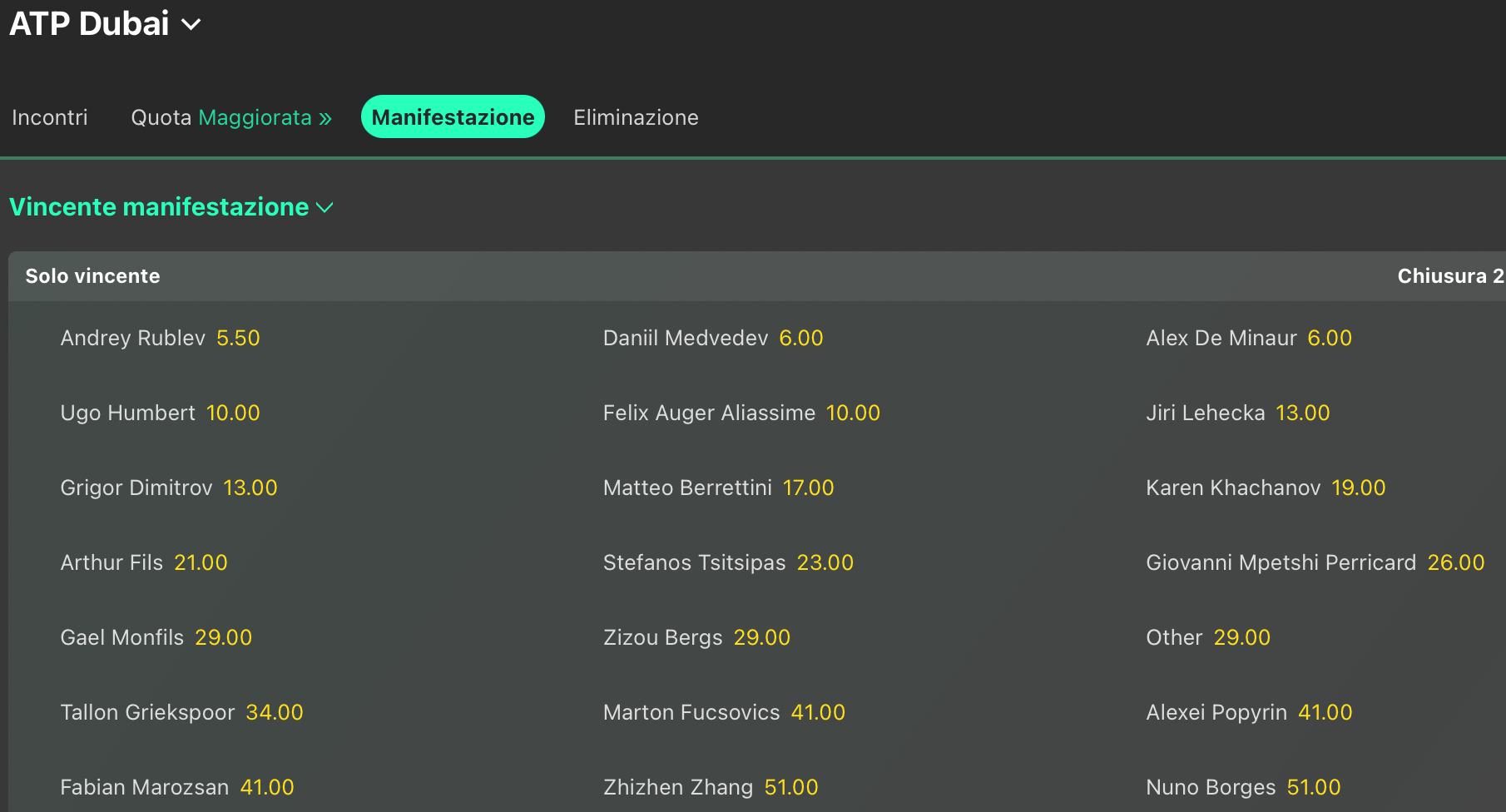 A Dubai comandano i russi, con Daniil Medvedev col seed #1, ma che nelle lavagne delle quote antepost per la vittoria finale si deve accodare di poco al connazionale Andrey Rublev @5.50 (contro il #6 di Medvedev). Anche Alex De Minaur @6 può putrire alla vittoria mentre Ugo Humbert e Felix Auger Alliasime sono più staccati @10. Un trionfo di Matteo Berrettini non è semplice, ma nemmeno impossibile, col romano offerto in seconda fascia @17 volte la posta.