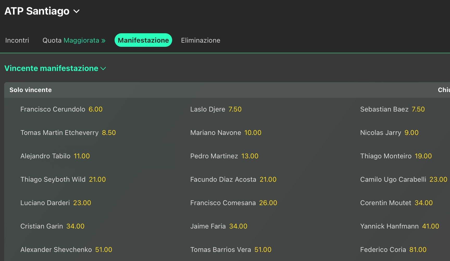 Abbiamo detto di Francisco Cerundolo favorito @6 su Laslo Djere @7.50 e Sebastian Baez @7.50. Attenzione anche a Martin Etcheverry @8.50 mentre il trionfo azzurro con Luciano Darderi si gioca @23 volte la posta.