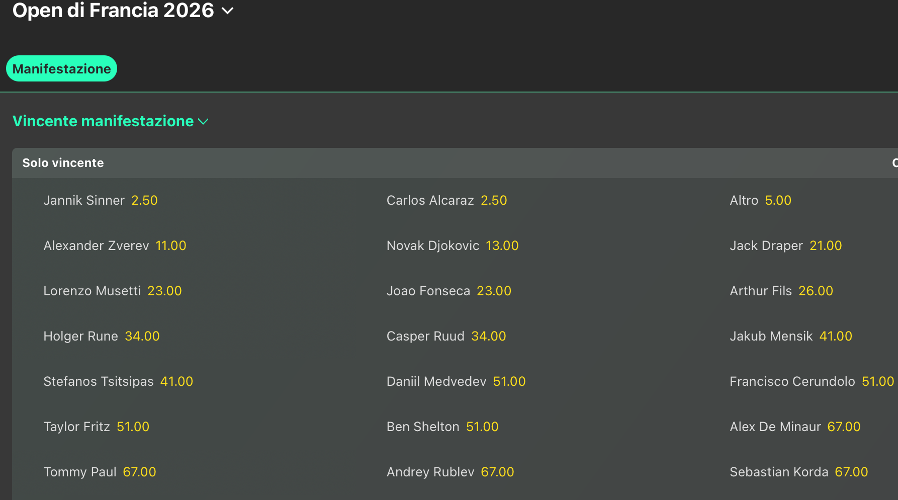 Già disponibili le quote antepost per il Roland Garros 2026 dove Sinner ed Alcaraz aprono letteralmente alla pari @2.50 entrambi, ma è ancora presto per pensare al French Open del prossimo anno.